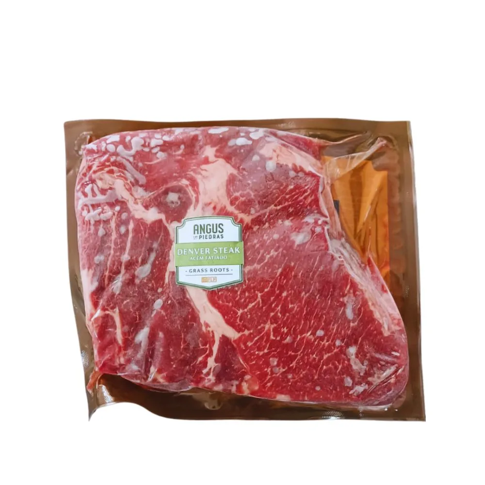 O Denver Steak Angus Grass Fed Las Piedras é um corte que se localiza na parte dianteira do boi, mais precisamente na aréa do acém. Esse corte é muito marmorizado e macio, mesmo sendo de uma parte mas rigida do gado. Um corte de fácil e rápido preparo. Produto de origem Uruguaia.